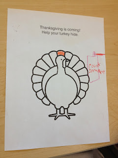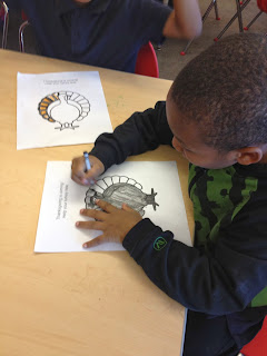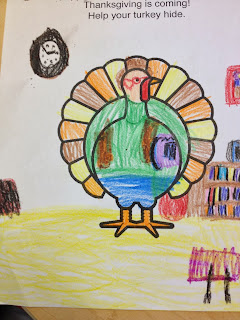 Happy Turkey Day, everyone! I just wanted to share some really awesome artwork the first graders came up with after our Thanksgiving lesson this week. We read ‘Twas the Night Before Thanksgiving by Dav Pilkey. If you know the story, you know that at the end, the kids sneak the turkeys out of the farm under their shirts. That prompted a discussion–how do you disguise a turkey? Luckily our creative first graders had a lot of ideas. Check some of them out below.
