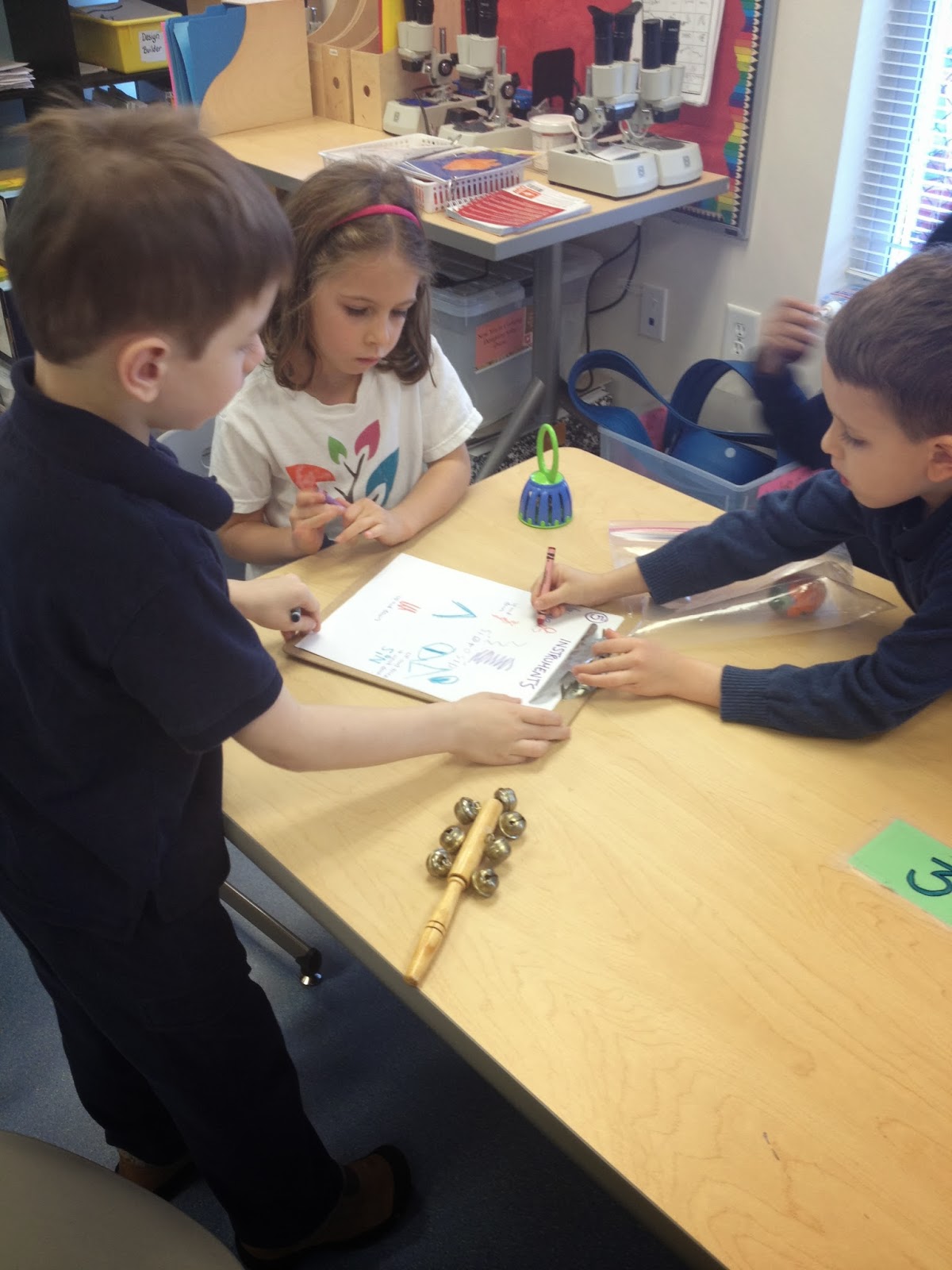 Kindergarten and 1st grade students took their exploration of the pendulum to a deeper level. They made predictions, completed a few different tests and communicated their findings to each other verbally and by sharing their written observations. In addition, I encouraged them to view the path of the pendulum from more than one perspective and see if that changes anything they saw.