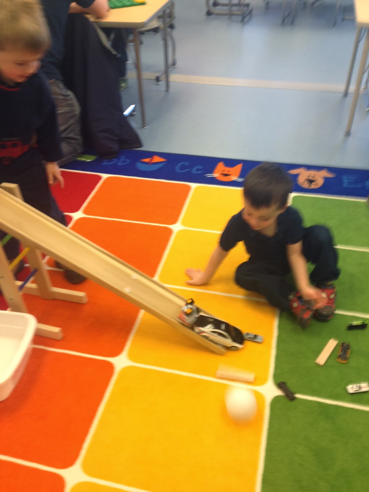 Preschool 3 year olds “crash and bash” as this center with a variety of cars and balls.