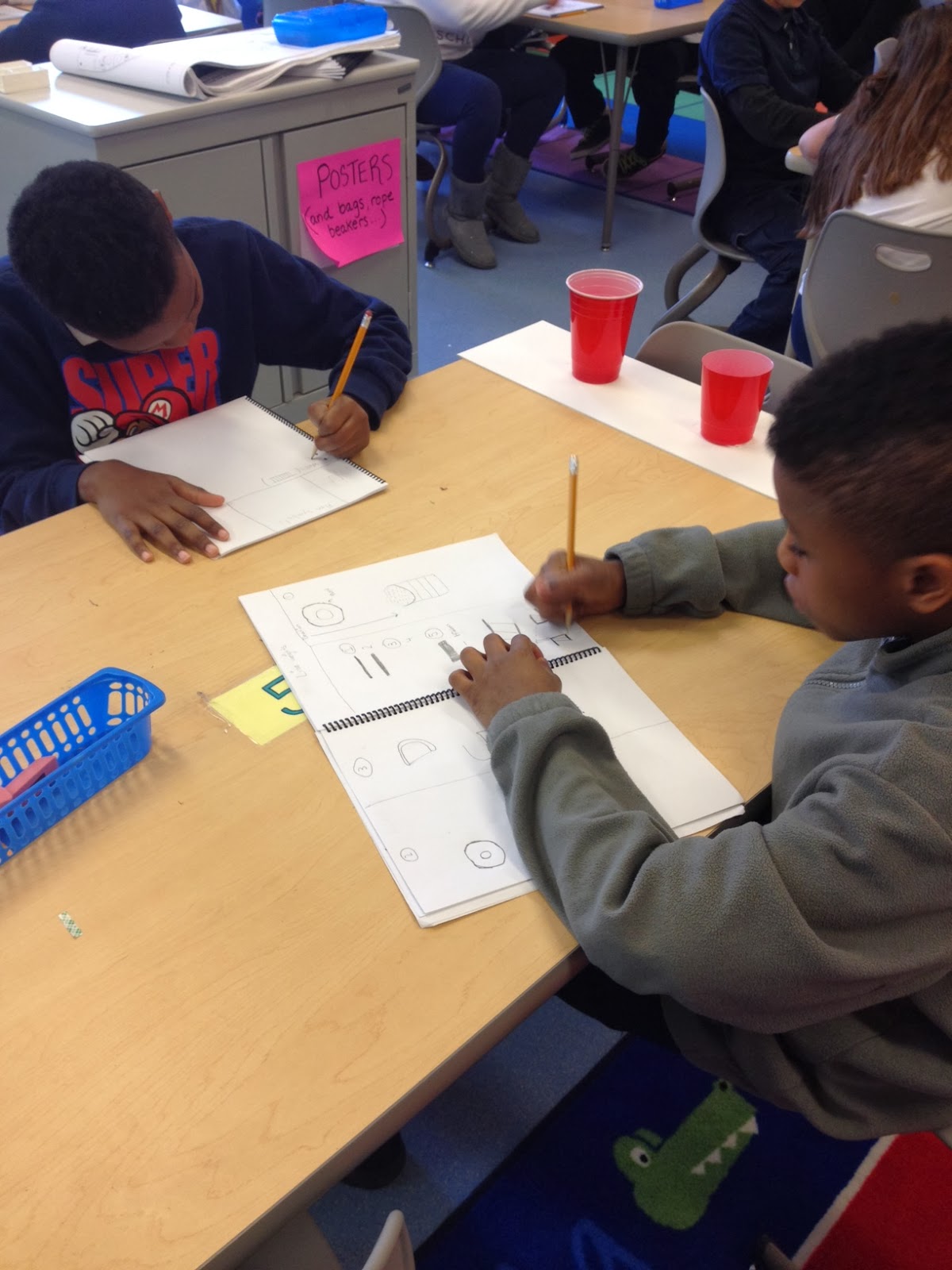 Using inspiration from their senses activity, students get to work sketching some of their new ideas for their space. These students considered creating a “dragon table” that would feel smooth, look interesting and could be used in the “table toys” center.
